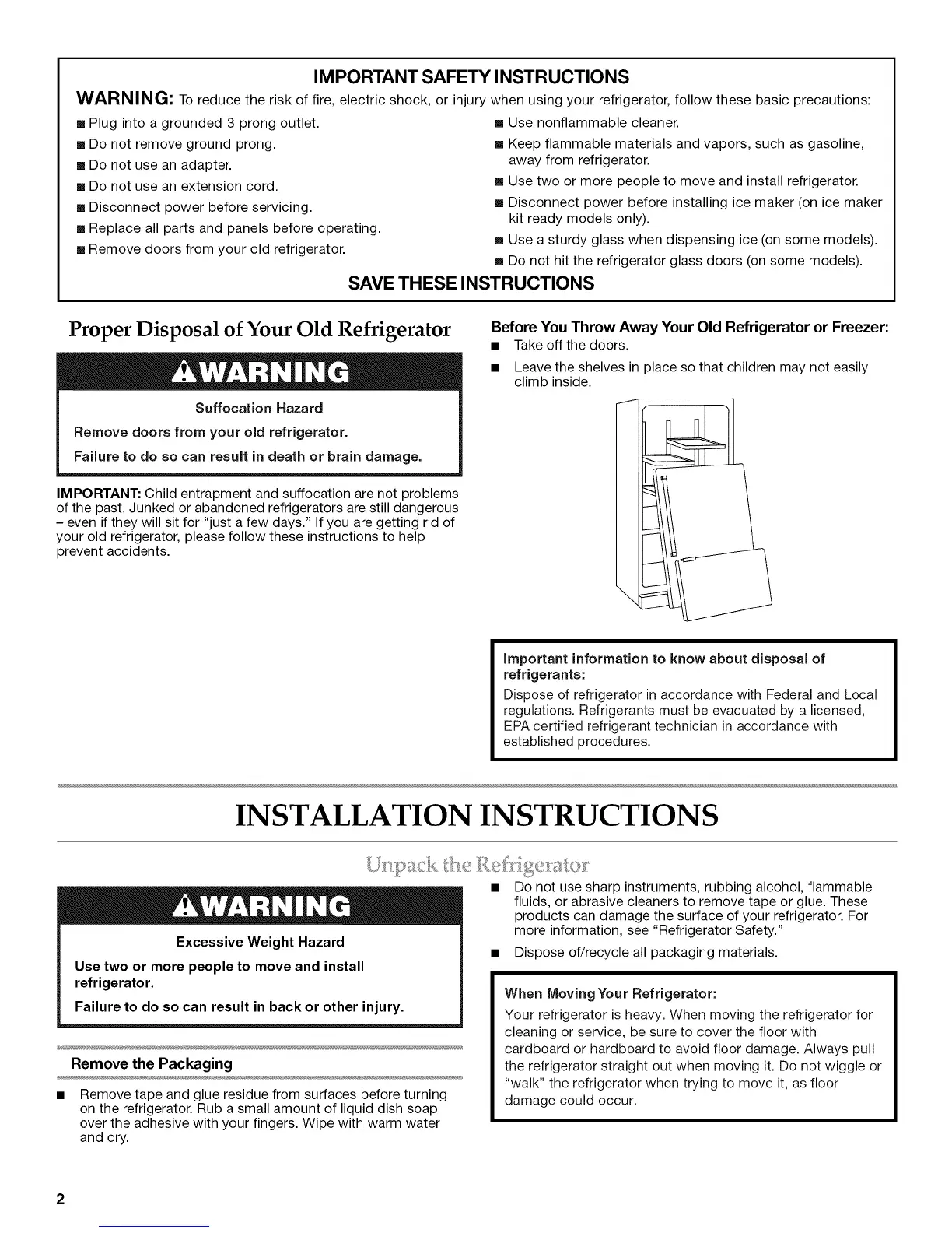 Use two or more people to move and install refrigerator.