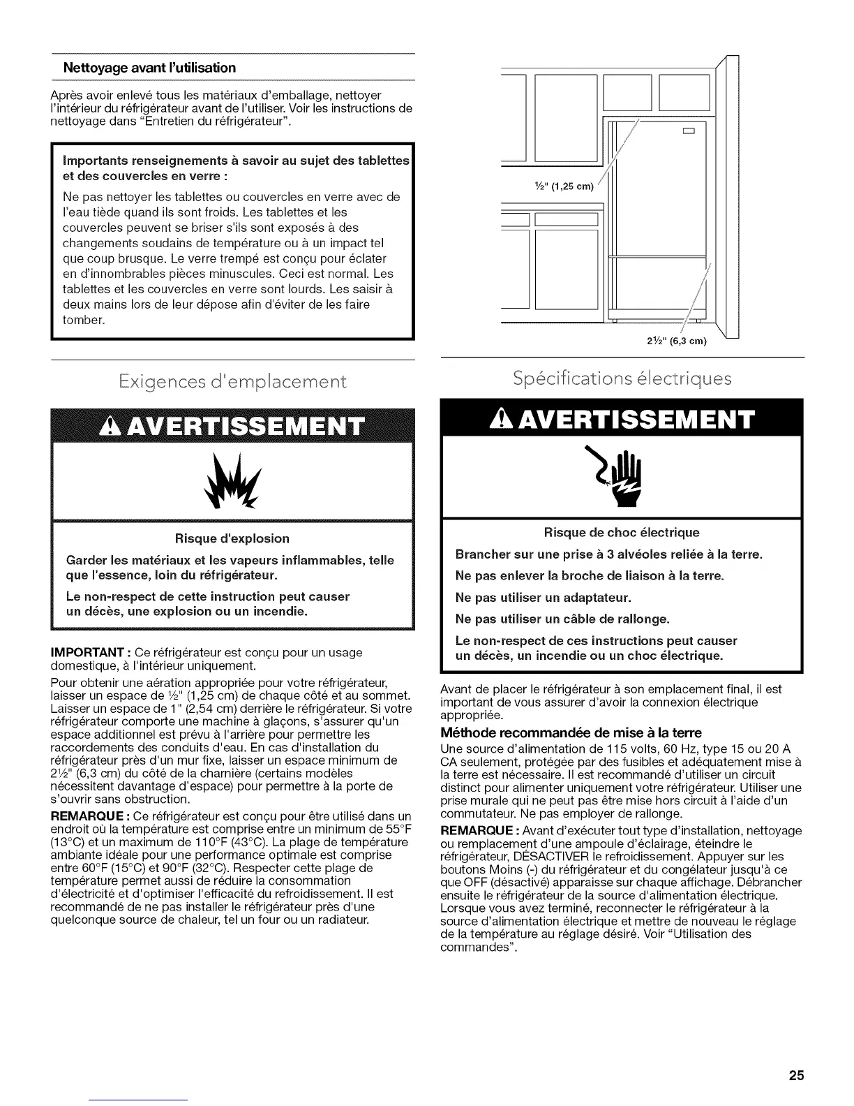 Laisser un espace de 1" (2,54 cm) derriere le refrigerateur. Si votre