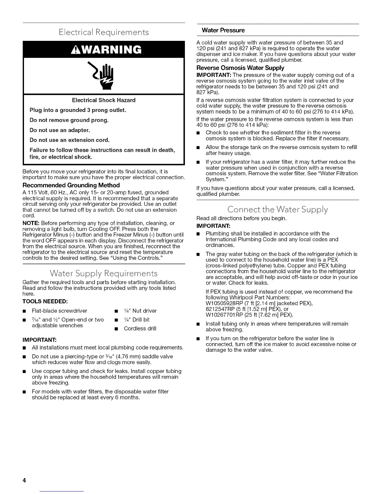 KitchenAid KBRS22KCMS00 - Electrical Requirements; Water Supply Requirements; Water Pressure