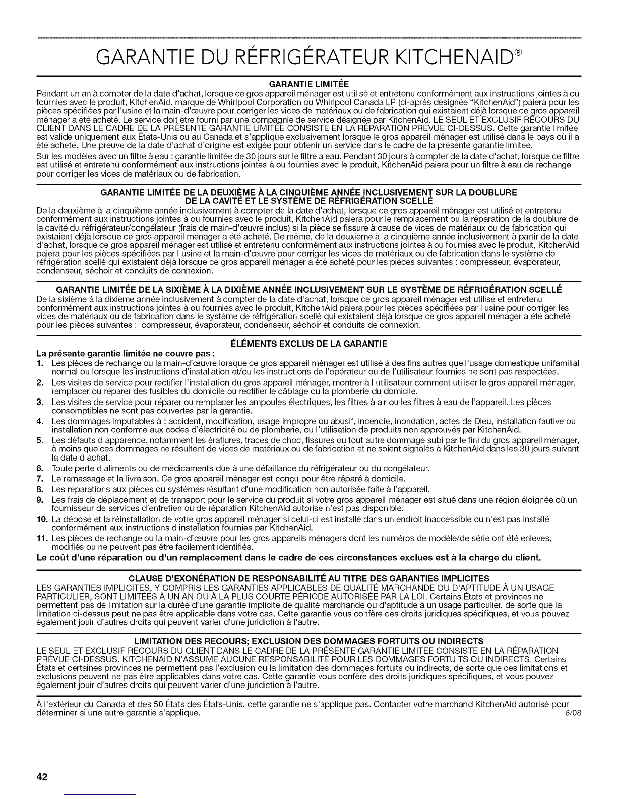 /_,I'exterieur du Canada et des 50 I:ttats des I:ttats-Unis, cette garantie ne s'applique pas. Contacter votre marchand KitchenAid autorise pour
