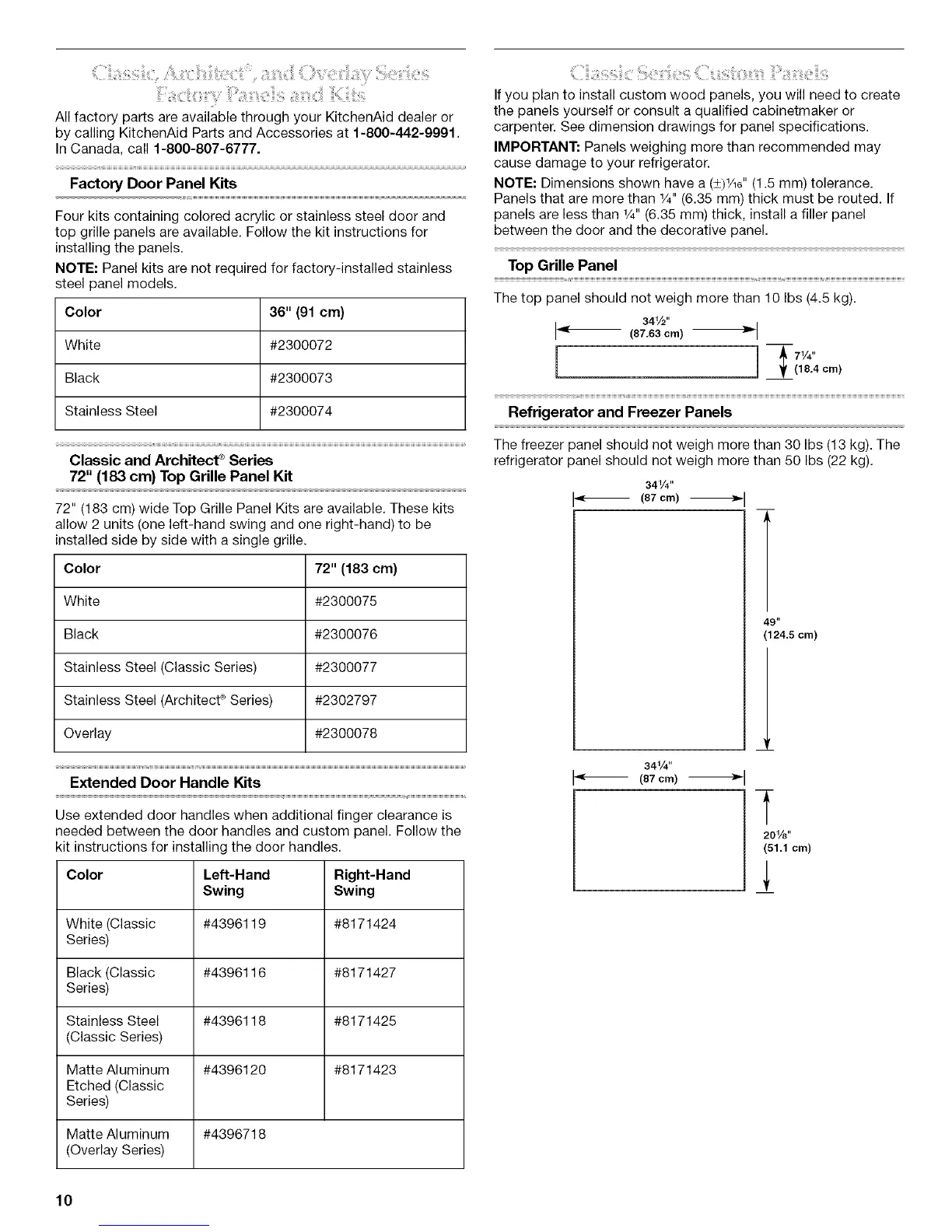 refrigerator panel should not weigh more than 50 Ibs (22 kg).