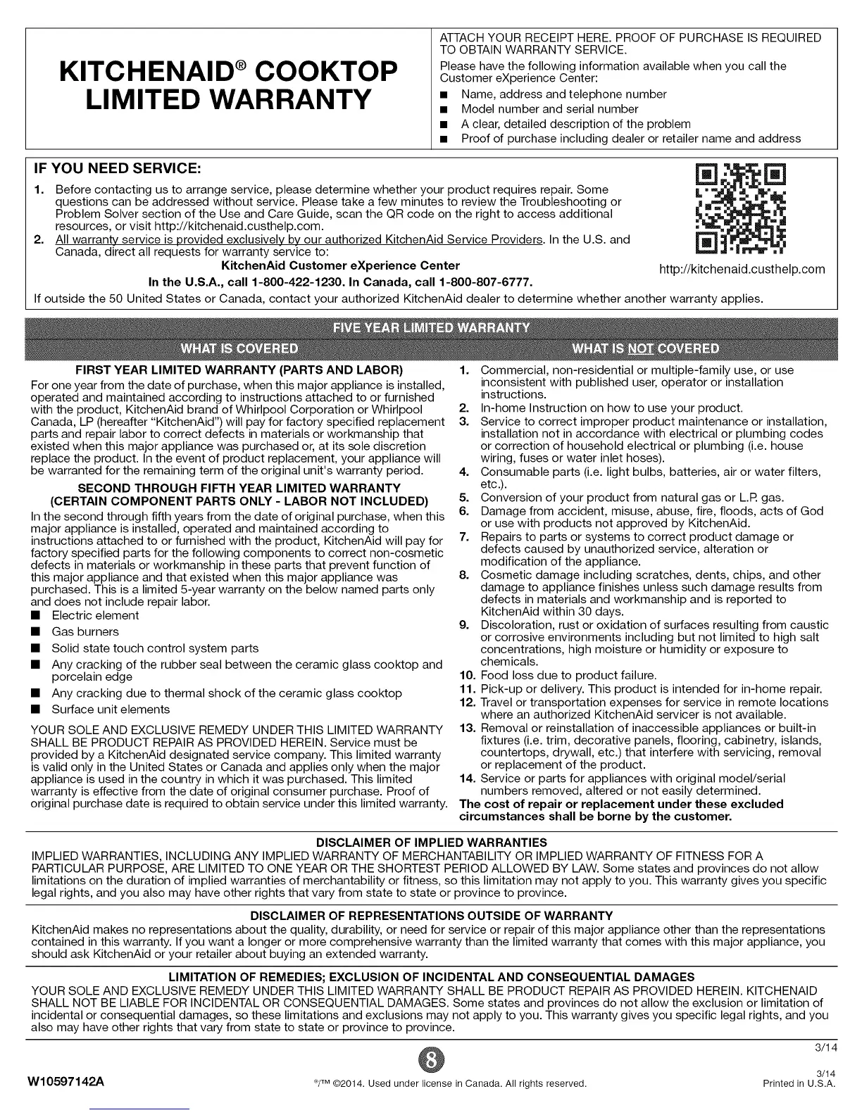 KitchenAid makes no representations about the quality, durability, or need for service or repair of this major appliance other than the representations