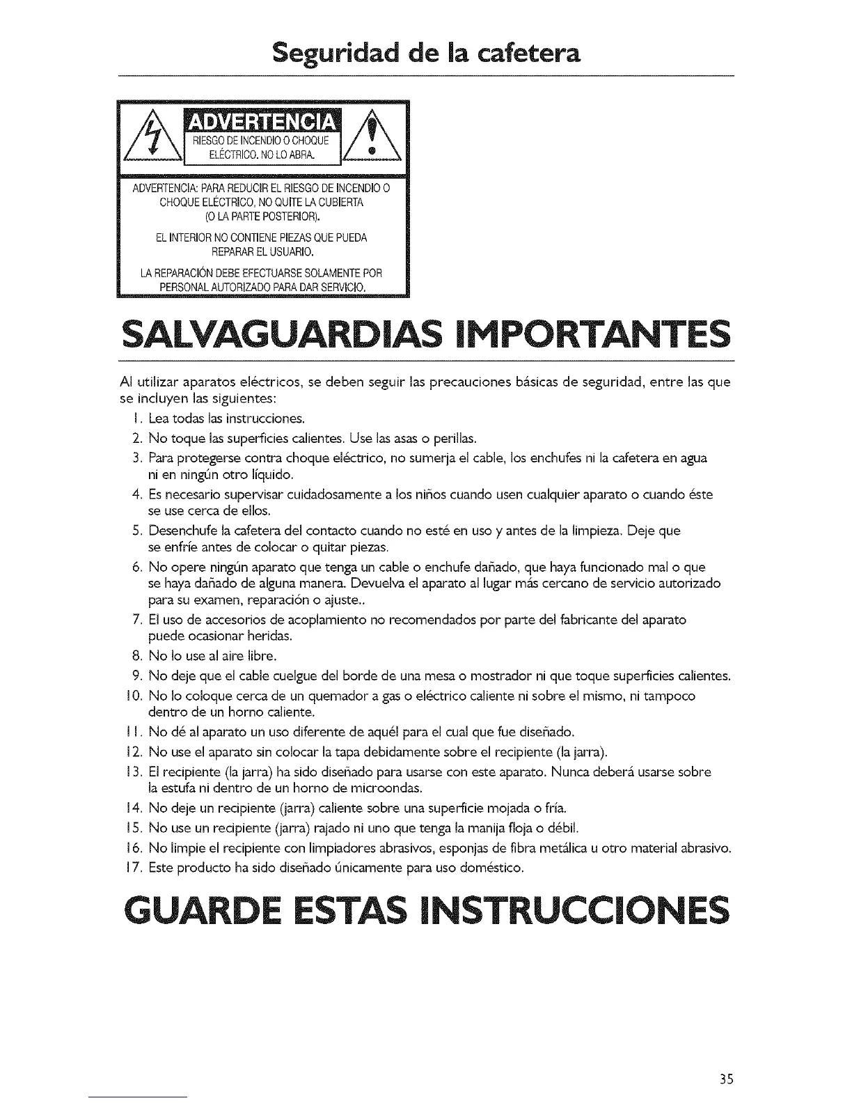 3. Para protegerse contra choque el6ctrico, no sumerja el cable, los enchufes ni la cafetera en agua