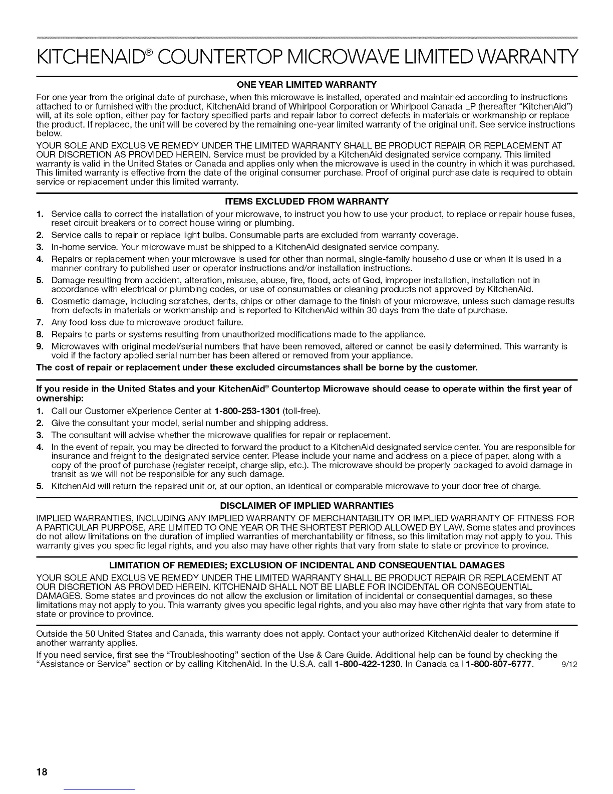 "Assistance or Service" section or by calling KitchenAid. In the U.S.A. call 1-800-422-1230. In Canada call 1-800-807-6777. 9/12