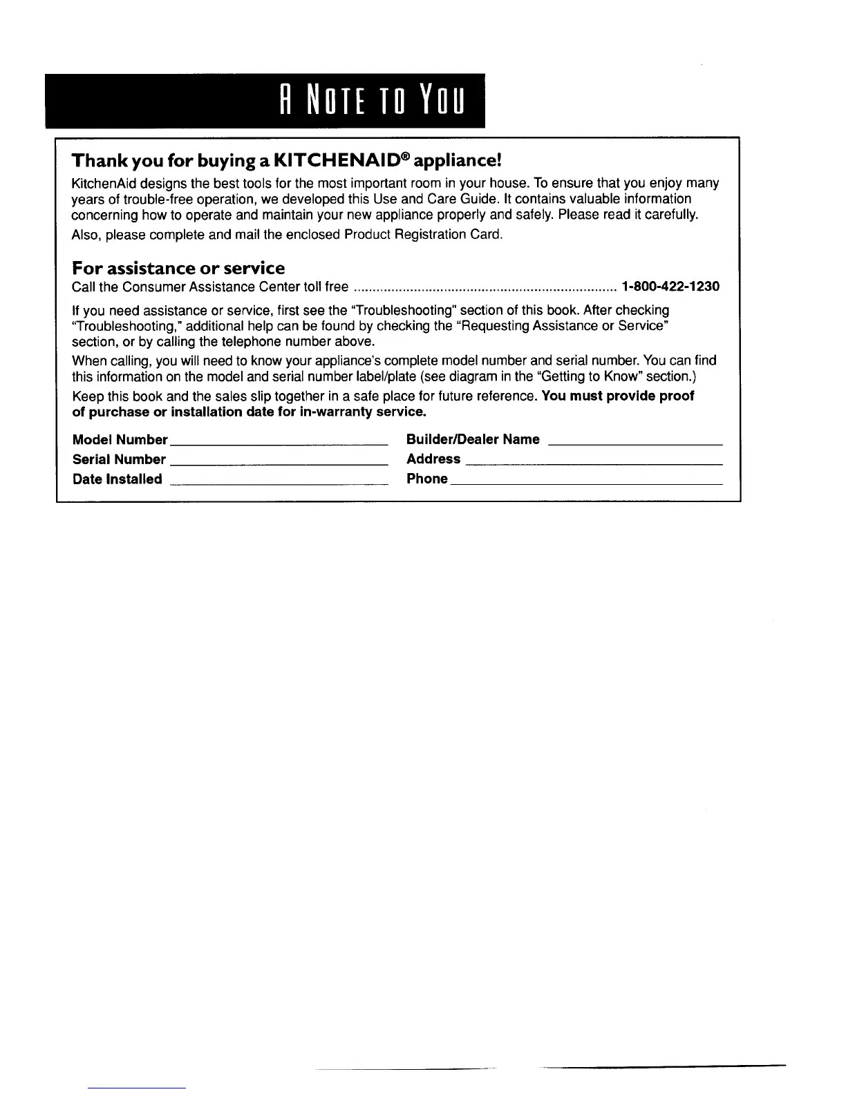 KitchenAid KCMS135 - A Note to You; For Assistance or Service