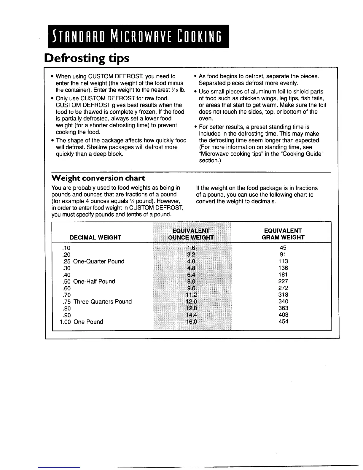 KitchenAid KCMS135 - Defrosting Tips and Weight Conversion
