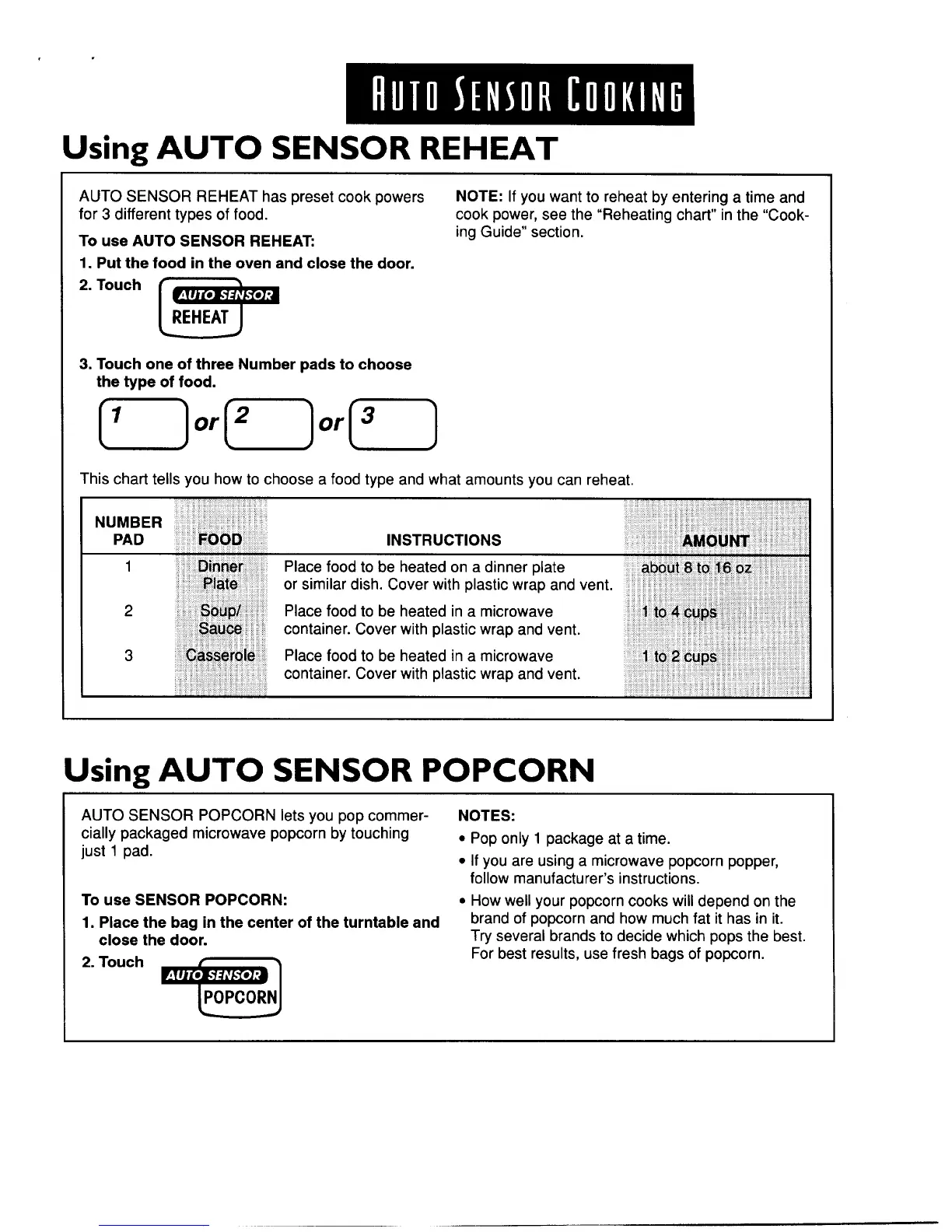 KitchenAid KCMS135 - Using Auto Sensor Reheat; Using Auto Sensor Popcorn