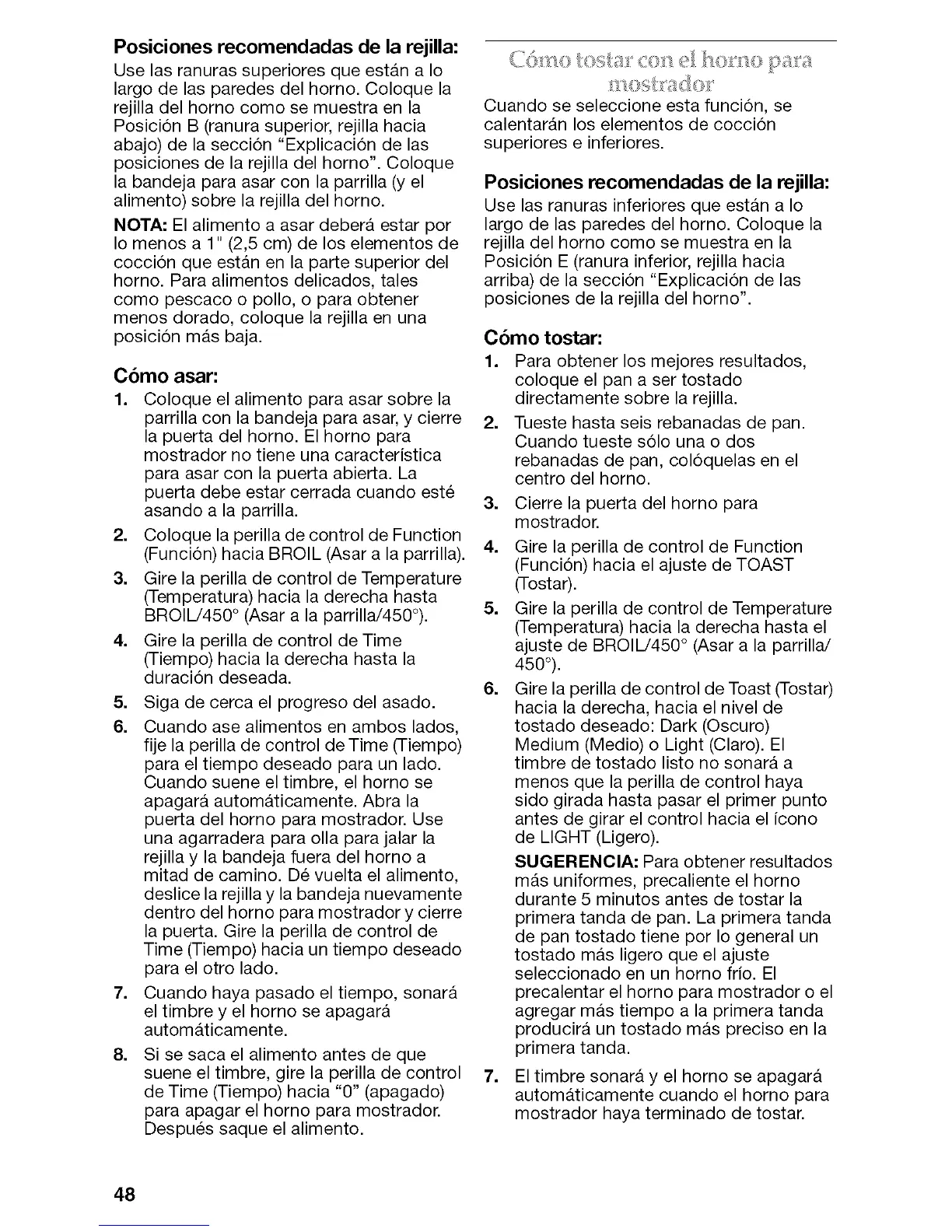posiciones de la rejilla del horno". Coloque