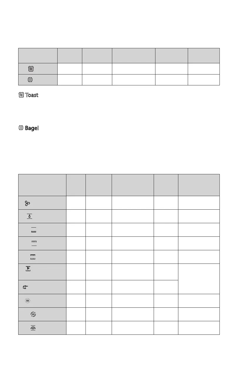 Refer to the below charts for toasting and cooking functions, or see detailed explanations and
