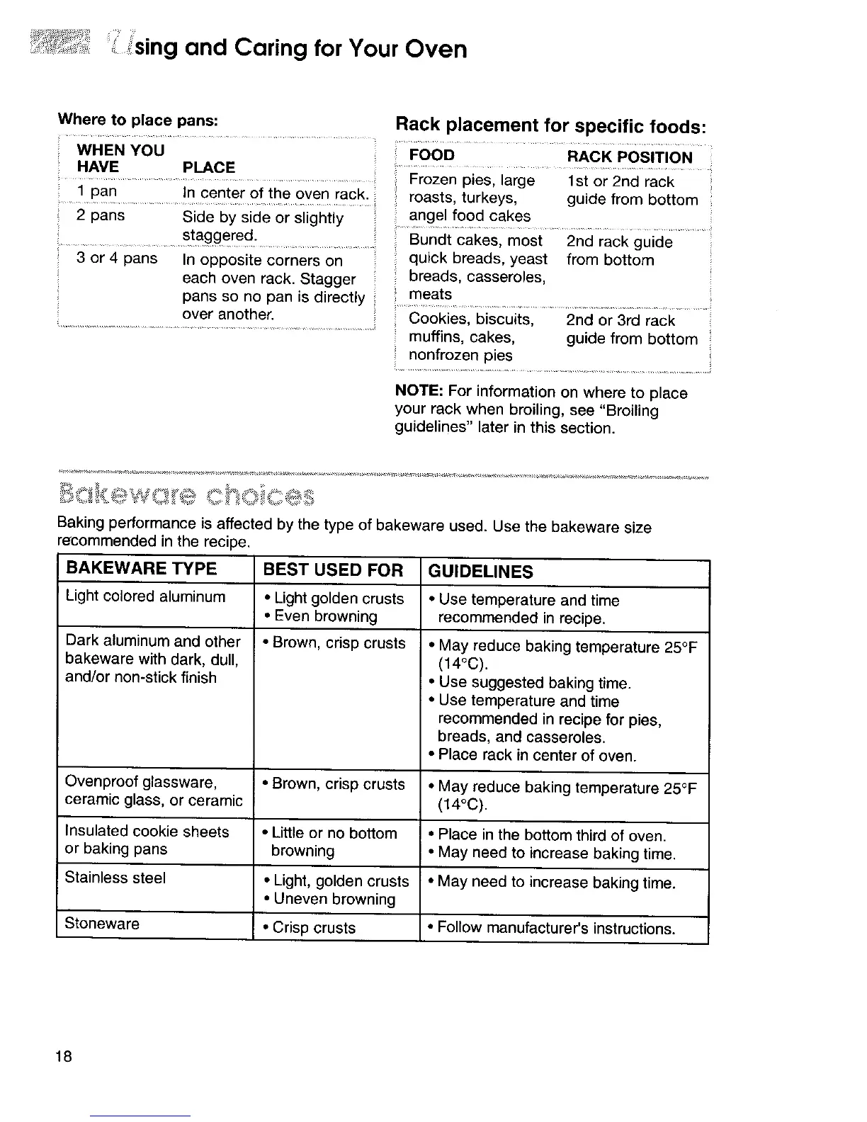 Baking performance is affected by the type of bakeware used. Use the bakeware size