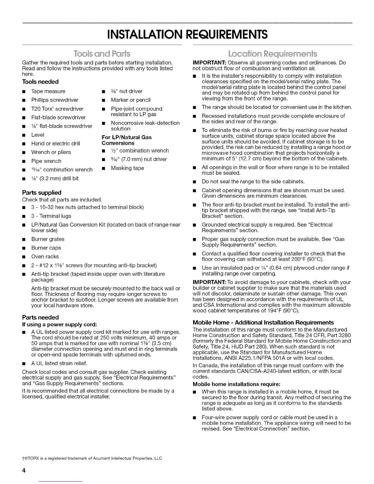 • When this range is installed in a mobile home, it must be