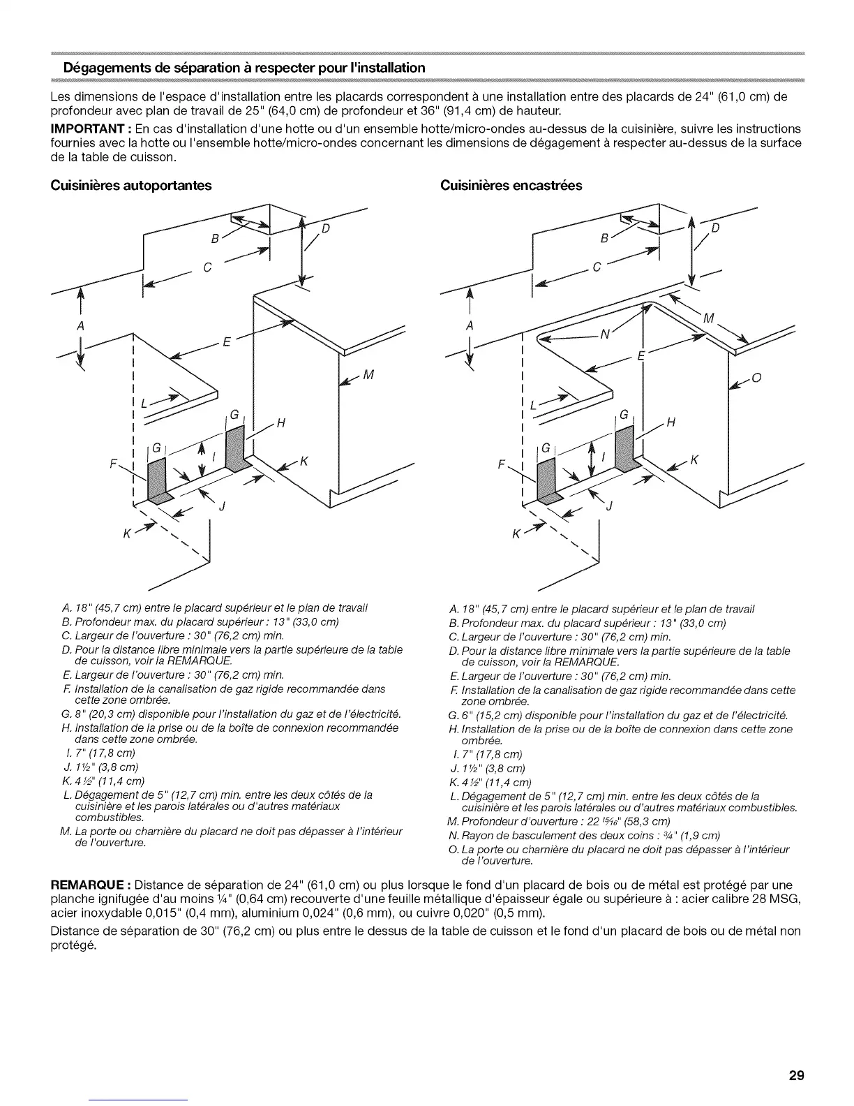 REMARQUE : Distance de separation de 24" (61,0 cm) ou plus Iorsque le fond d'un placard de bois ou de metal est protege par une