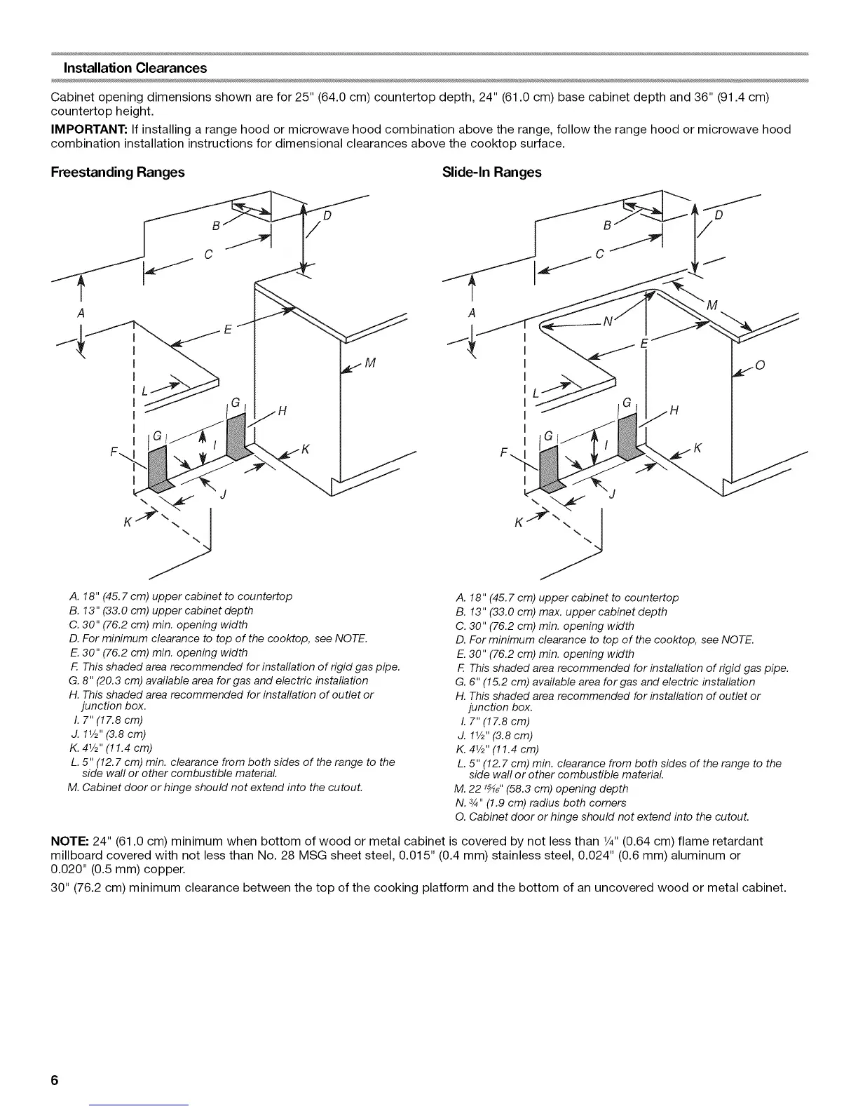 NOTE: 24" (61.0 cm) minimum when bottom of wood or metal cabinet is covered by not less than 1/4"(0.64 cm) flame retardant