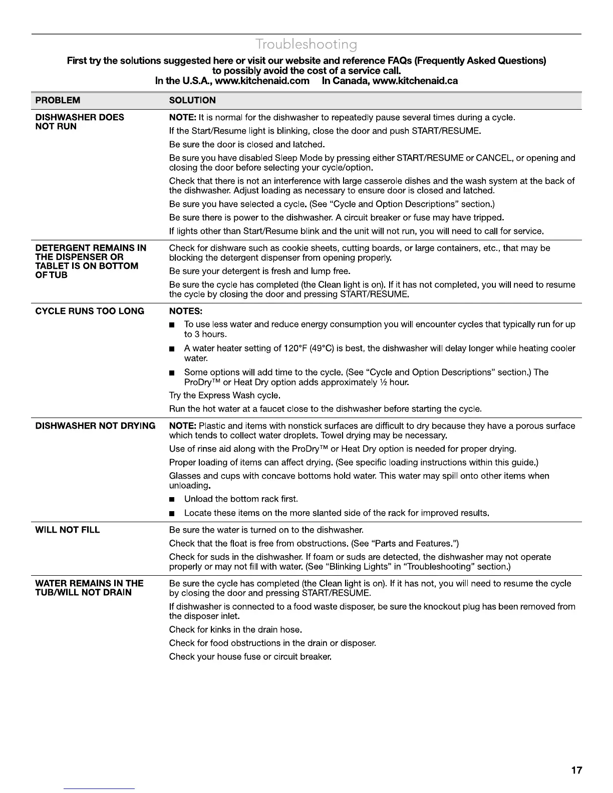 KitchenAid KDTE204DBL - Troubleshooting; Dishwasher Does Not Run; Detergent Remains in Dispenser or Tablet at Bottom of Tub; Cycle Runs Too Long