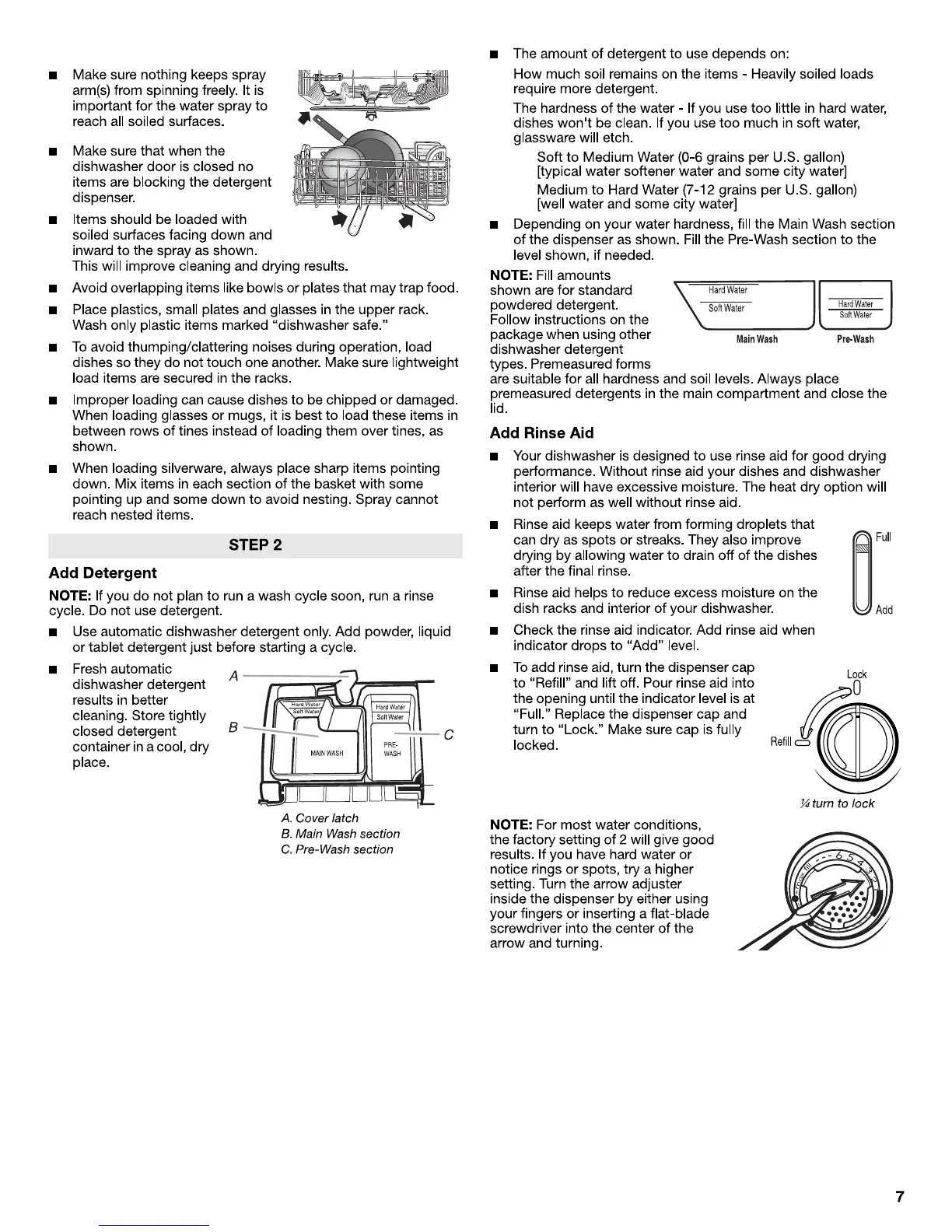 KitchenAid KDTE204DBL - Step 2: Add Detergent and Rinse Aid; Detergent Amount Guidelines; Rinse Aid Dispenser Operation