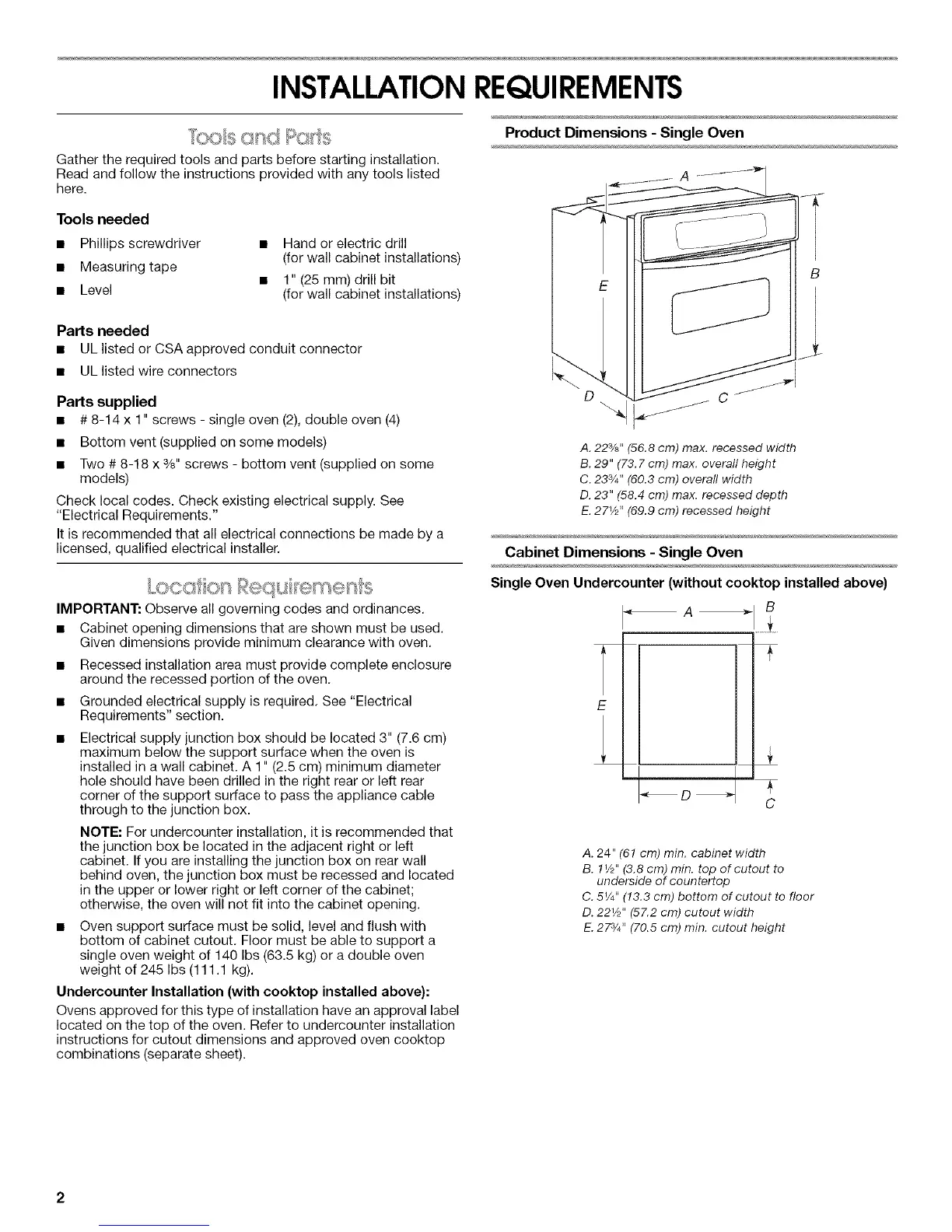 single oven weight of 140 Ibs (63.5 kg) or a double oven