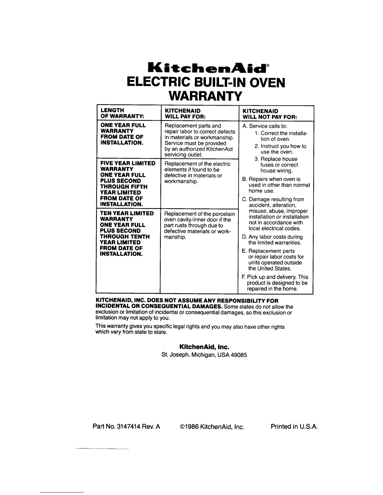 KitchenAid KEBI100 - KitchenAid Electric Built-In Oven Warranty