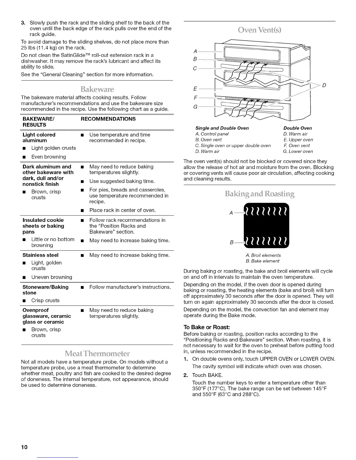 "Positioning Racks and Bakeware" section. When roasting, it is