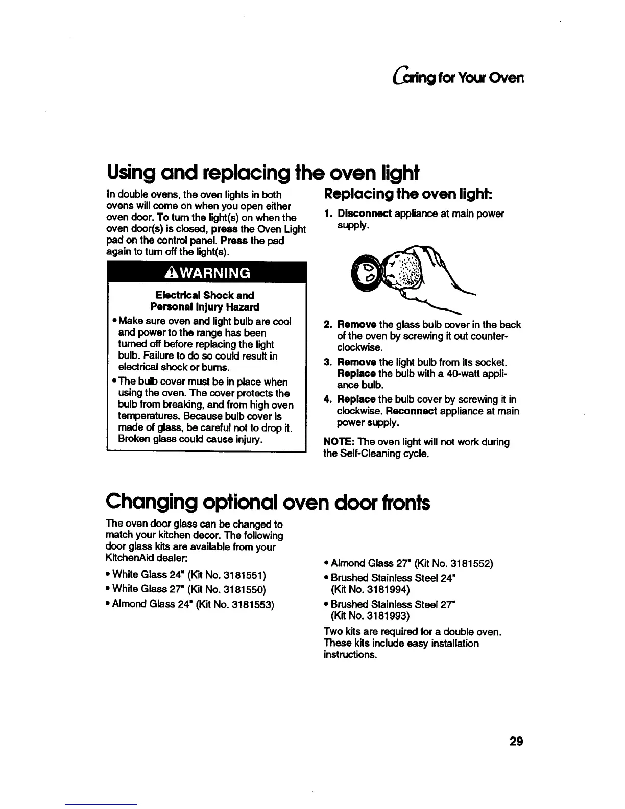 KitchenAid KEBS246Y - Caring for Your Oven: Lights and Door Fronts; Oven Light Operation and Replacement; Changing Optional Oven Door Fronts
