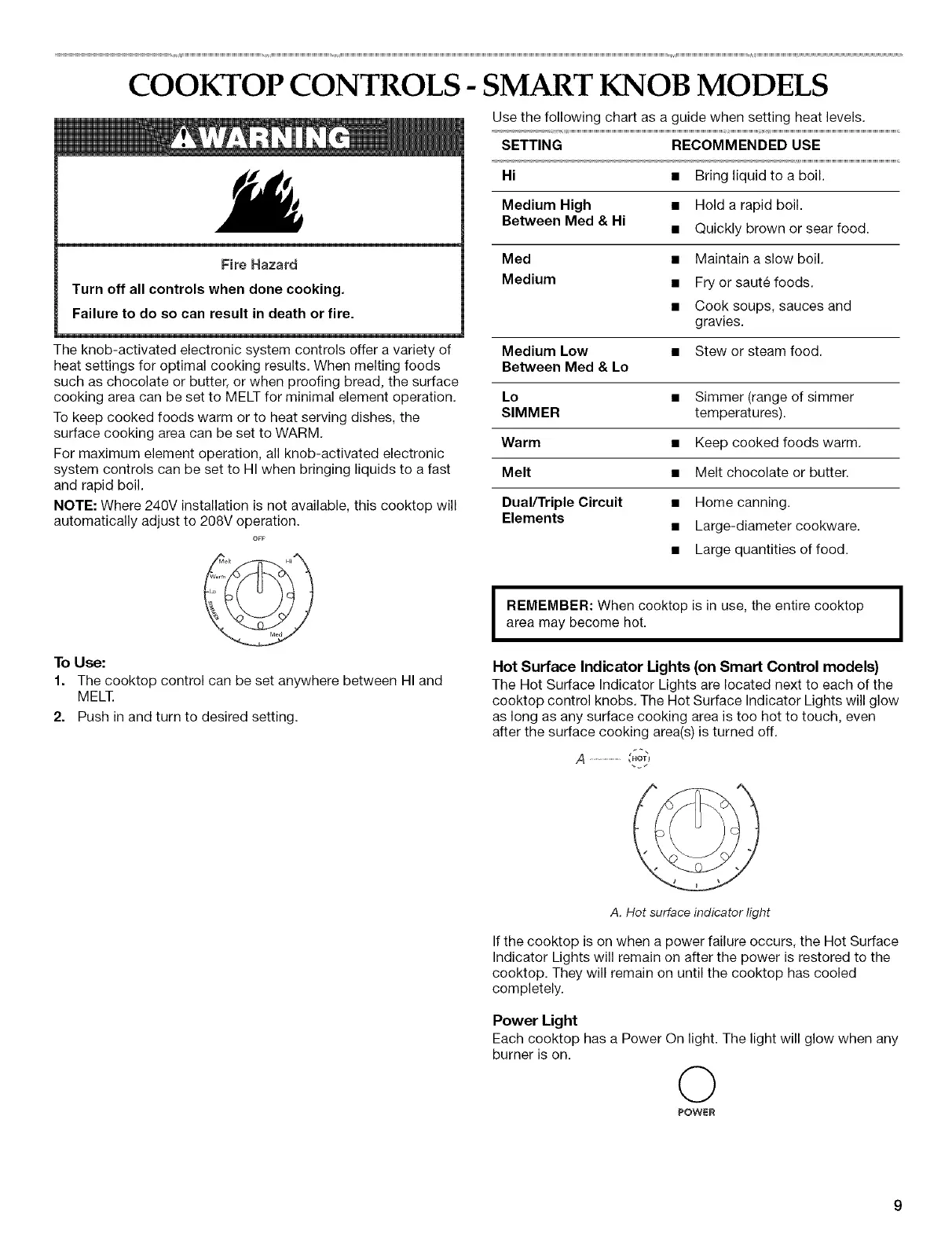 cooktop control knobs. The Hot Surface Indicator Lights will glow