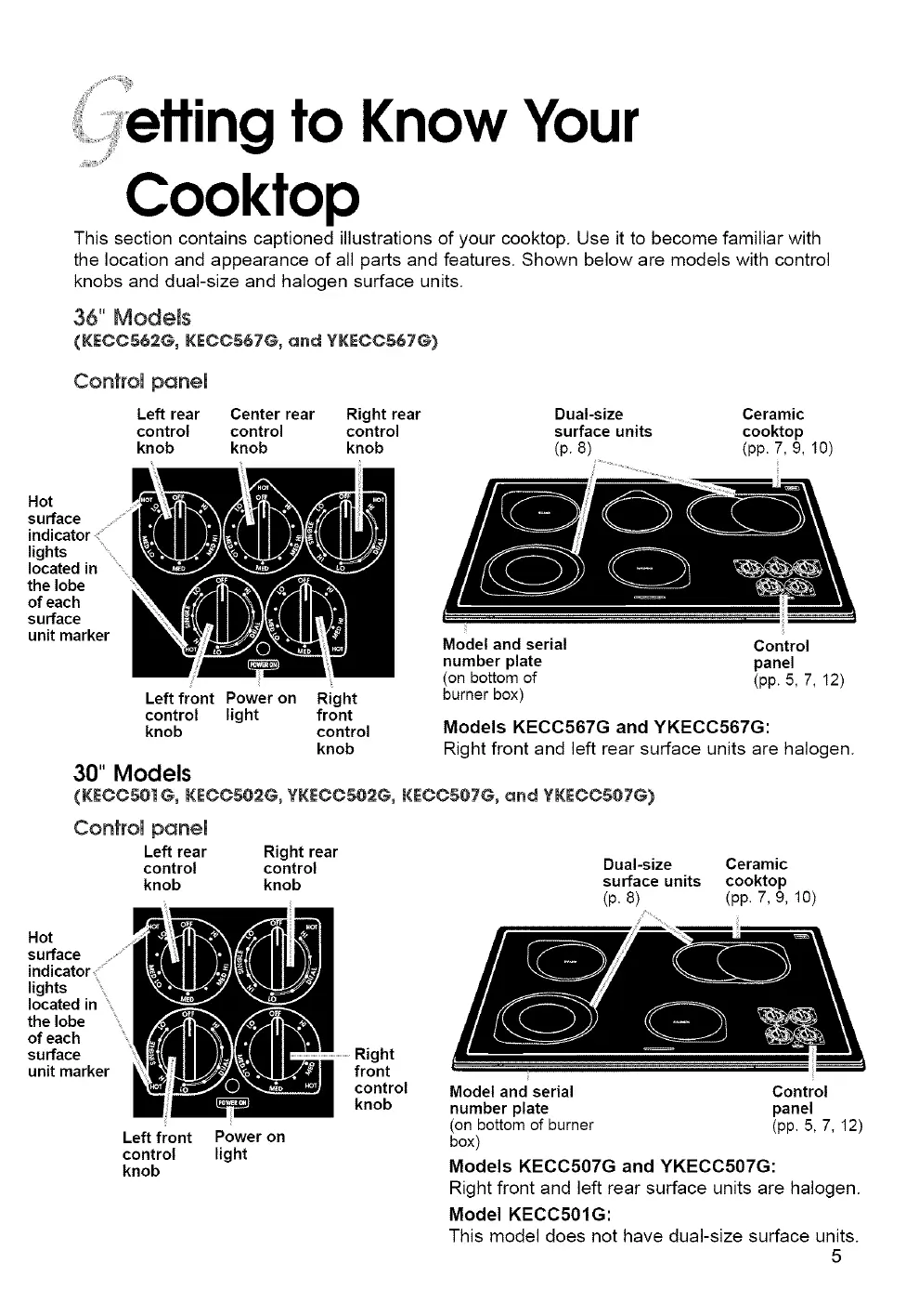 This section contains captioned illustrations of your cooktop. Use it to become familiar with