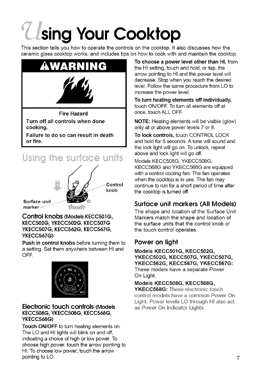 This section tells you how to operate the controls on the cooktop. It also discusses how the