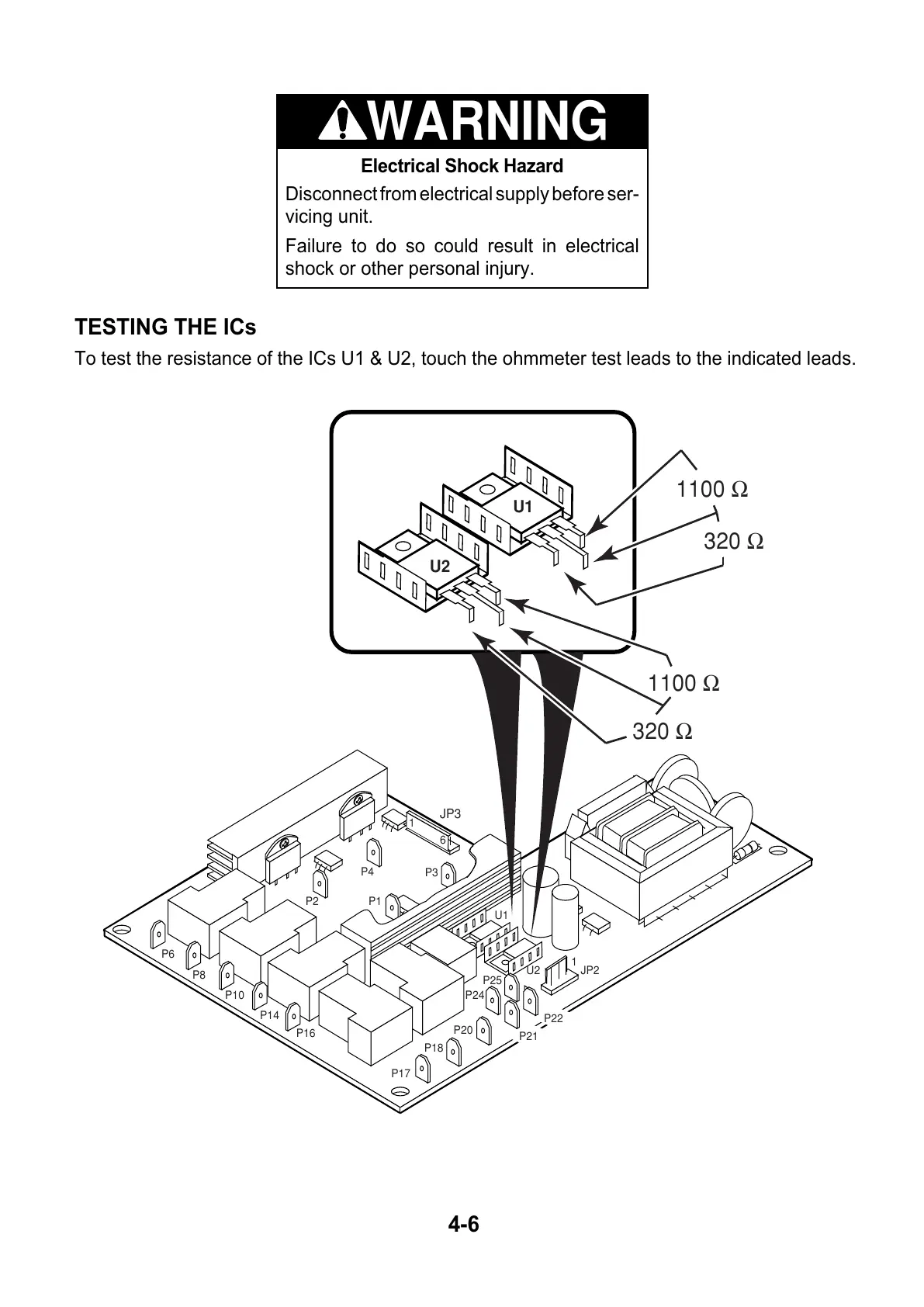 To test the resistance of the ICs U1 & U2, touch the ohmmeter test leads to the indicated leads.