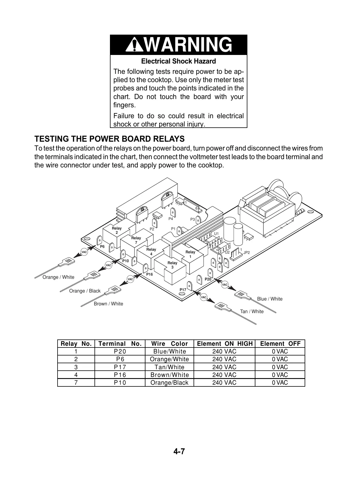To test the operation of the relays on the power board, turn power off and disconnect the wires from