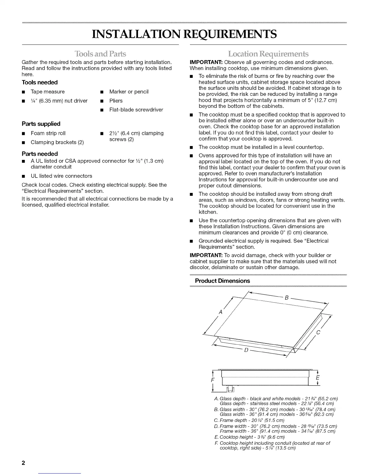 When installing cooktop, use minimum dimensions given.