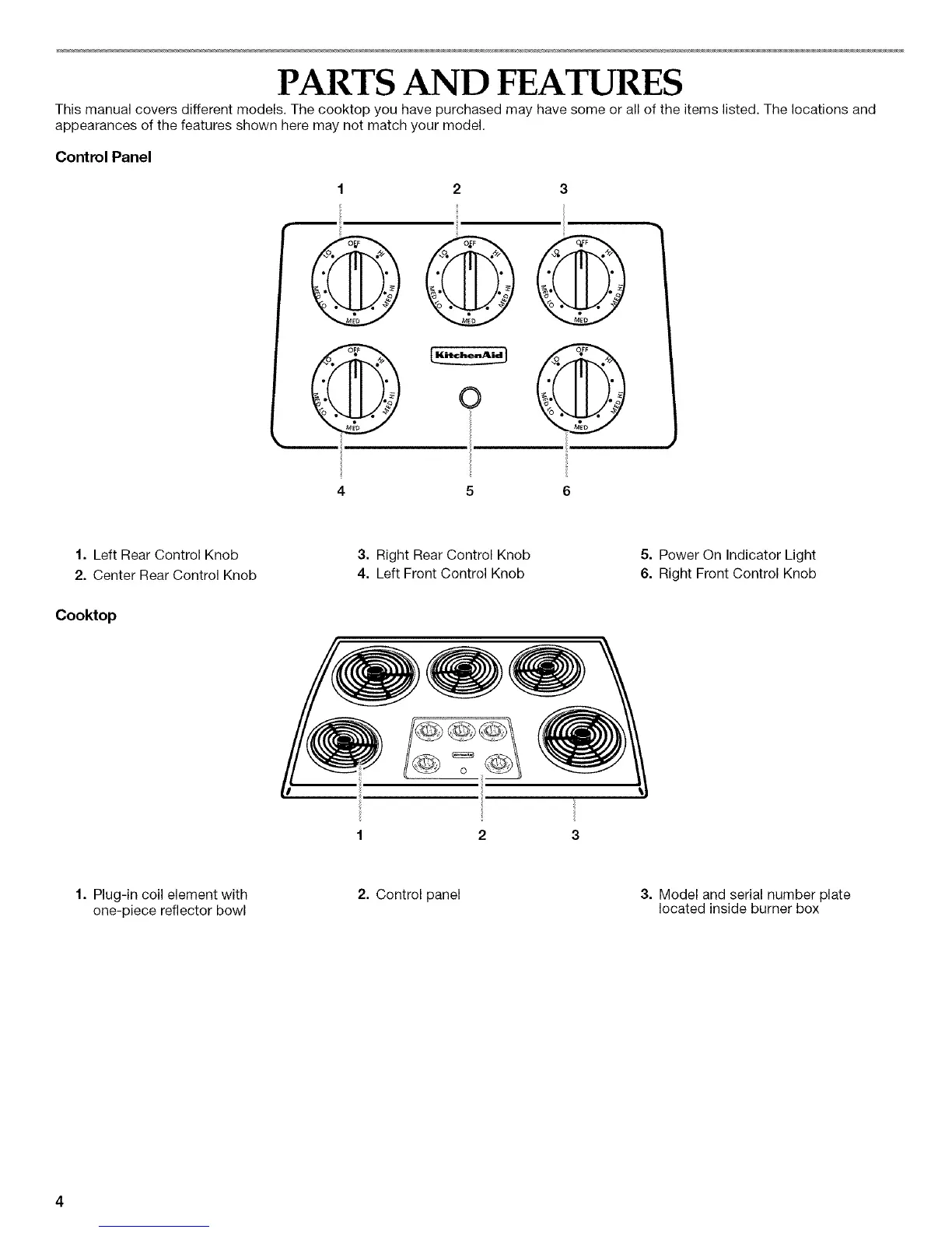 This manual covers different models. The cooktop you have purchased may have some or all of the items listed. The locations and