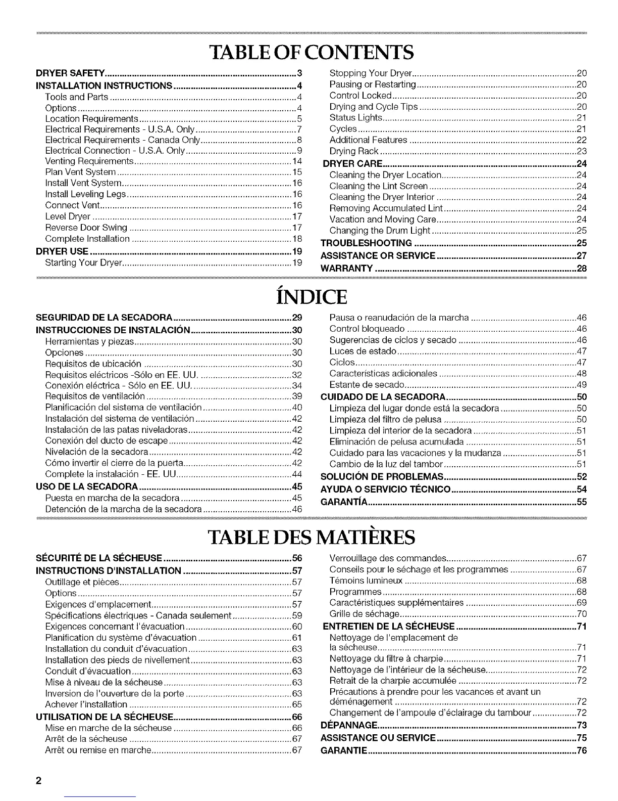 Nettoyage de I'interieur de la secheuse ..................................... 72