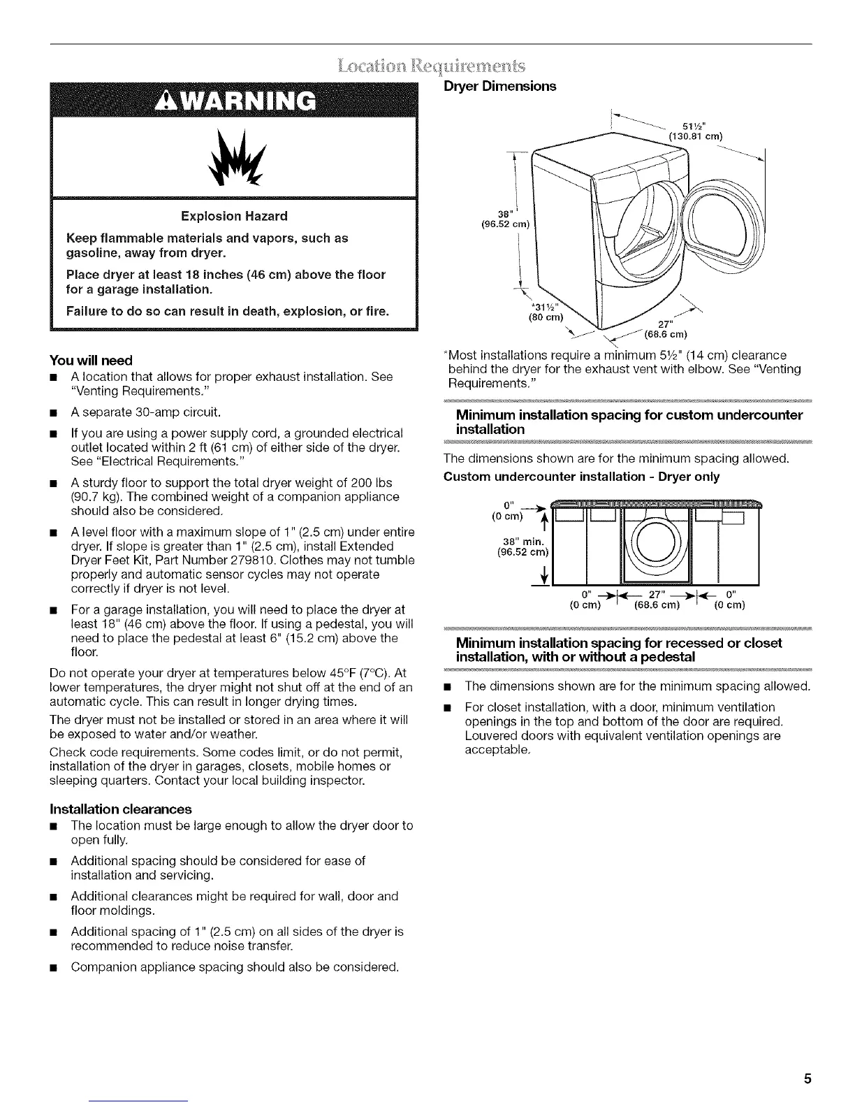 • A sturdy floor to support the total dryer weight of 200 Ibs