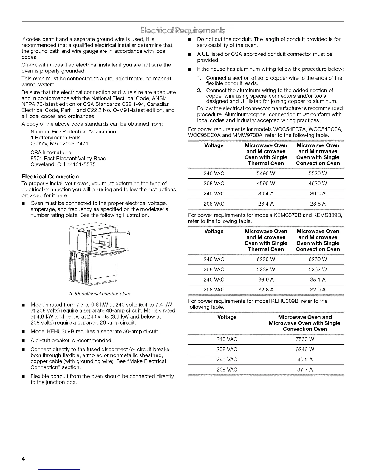 For power requirements for models WOC54EC7A, WOC54ECOA,