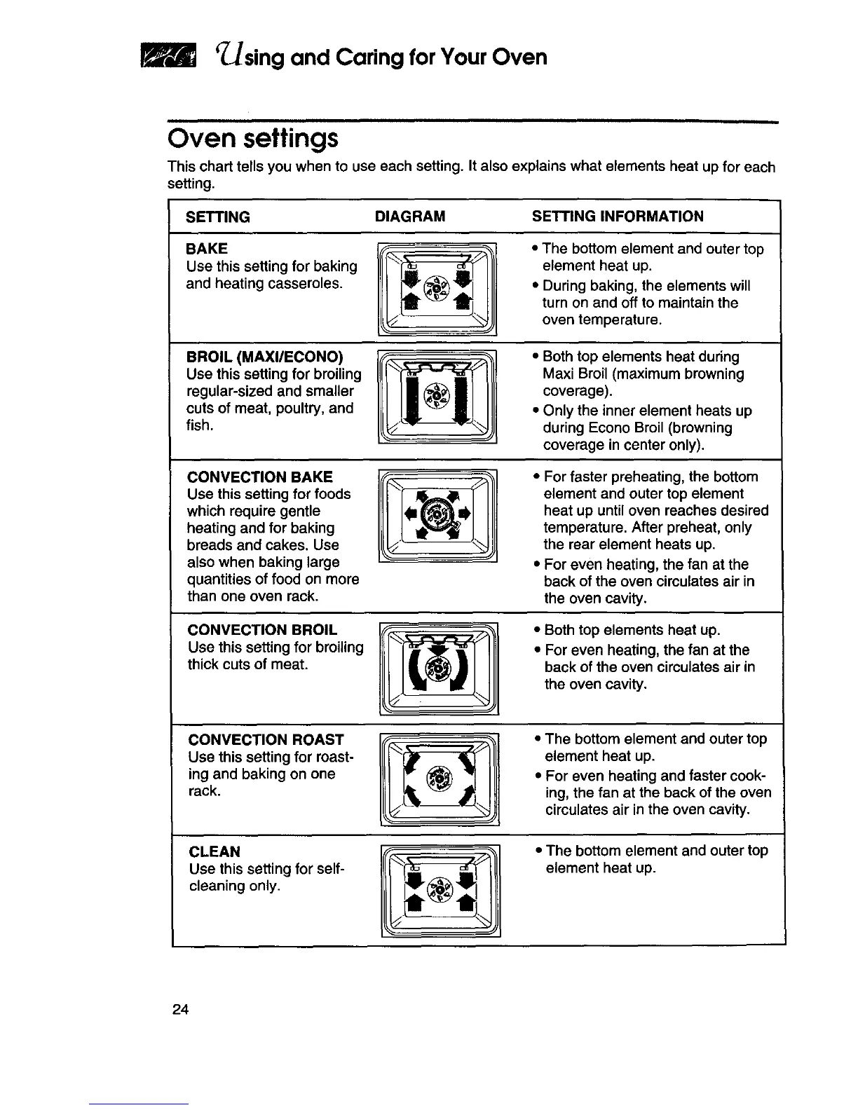 This chart tells you when to use each setting. It also explains what elements heat up for each
