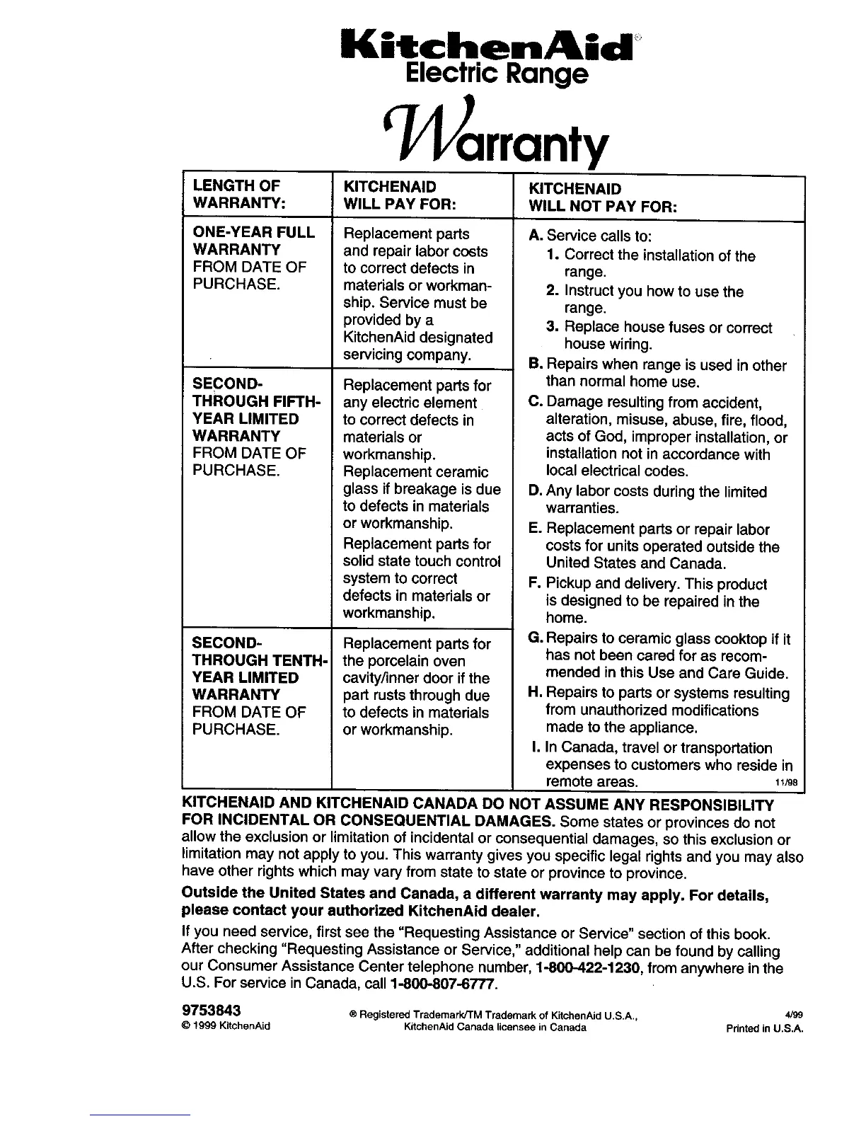 9753843 ® Registered Tredemark/TM Trademark of KitchenAid U.S.A., 4/99