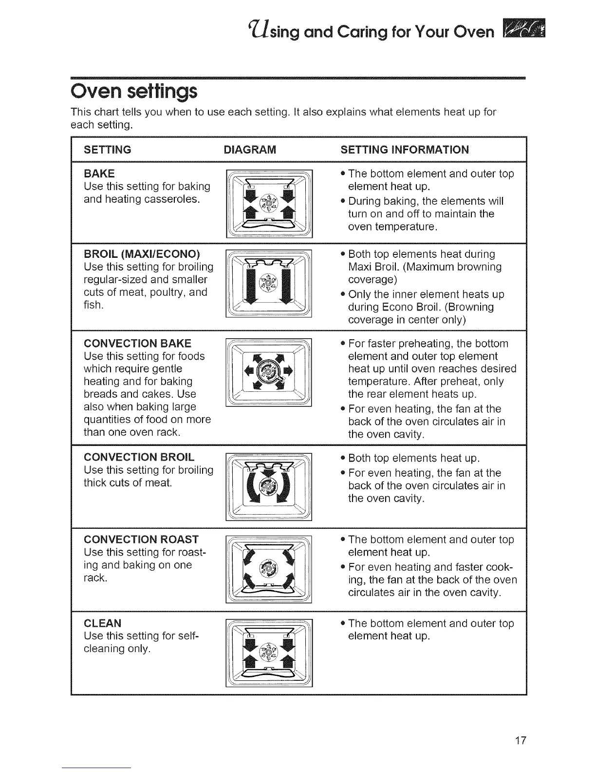 This chart tells you when to use each setting. It also explains what elements heat up for