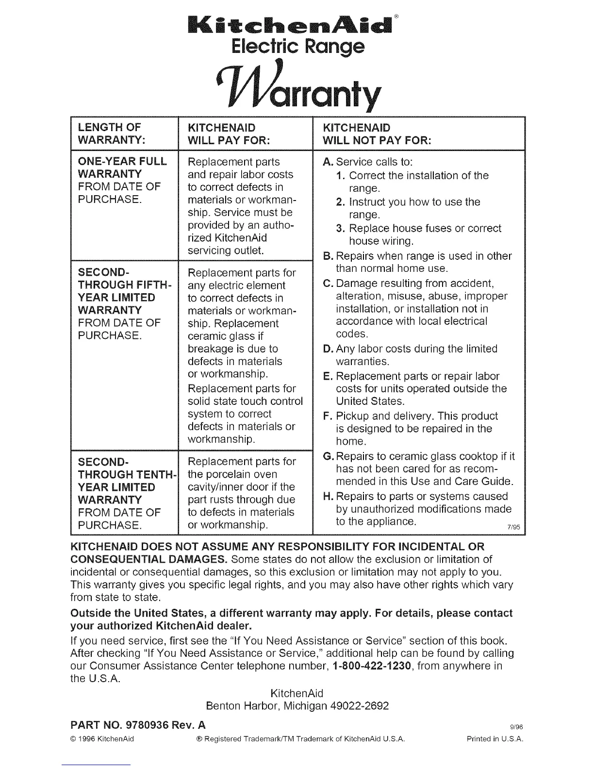 KITCHENAID DOES NOT ASSUME ANY RESPONSIBILITY FOR INCIDENTAL OR