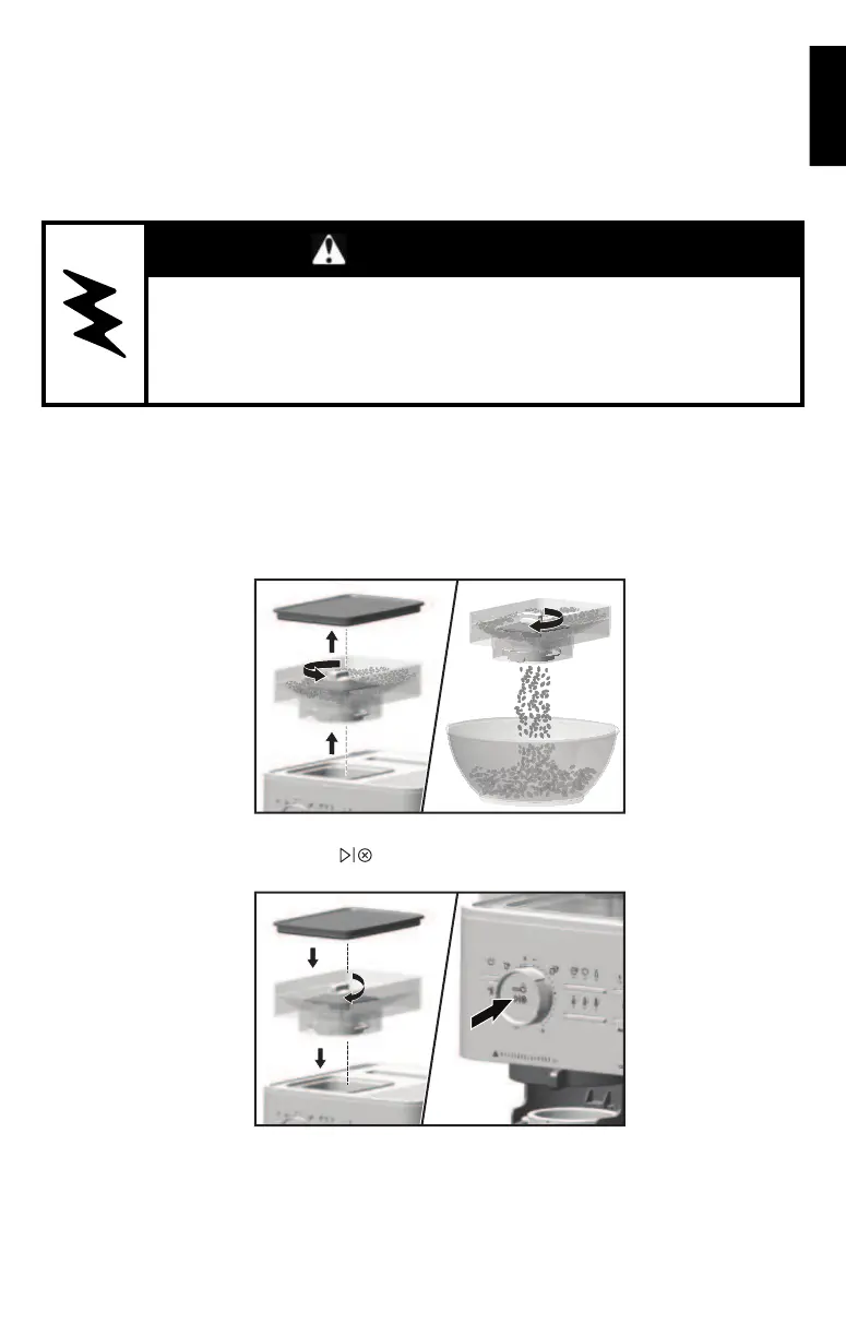 2. Remettre en place la Trémie à Grains de café vide et le couvercle. Appuyer sur la DEL du