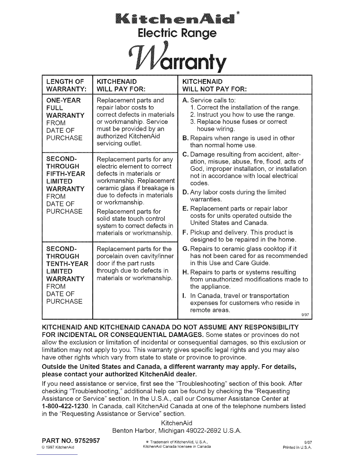 PART NO. 9752957 * Trademark of KitohenAid, USA., 9/97