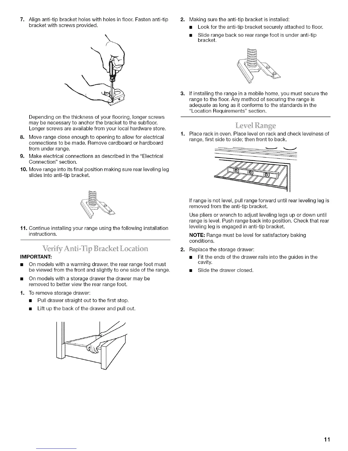 Align anti-tip bracket holes with holes in floor. Fasten anti-tip
