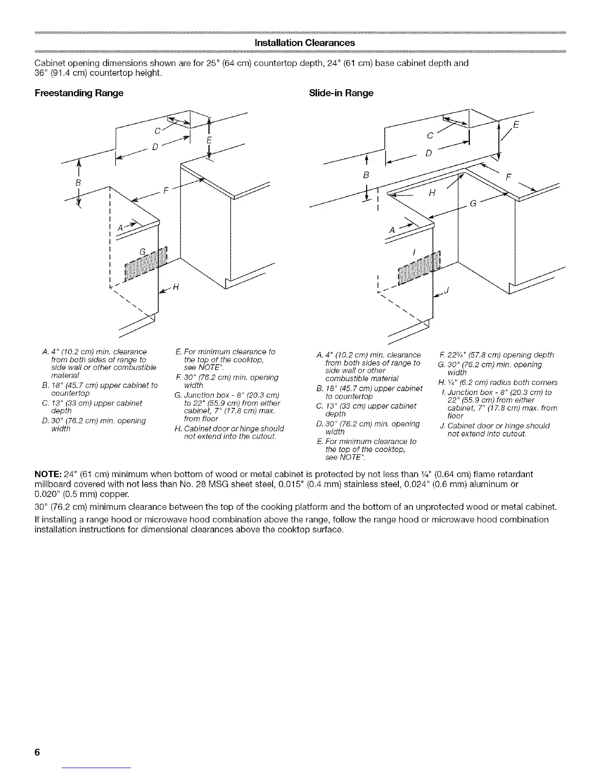 NOTE: 24" (61 cm) minimum when bottom of wood or metal cabinet is protected by not less than 1/4"(0.64 cm) flame retardant