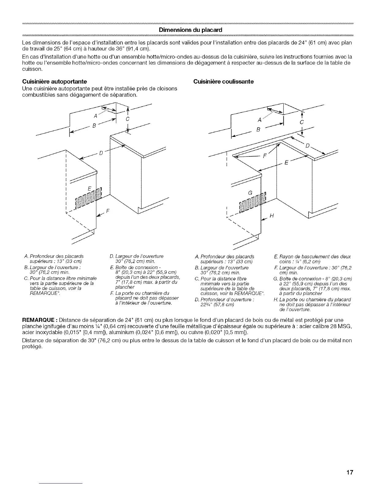 REMARQUE : Distance de separation de 24" (61 cm) ou plus Iorsque le fond d'un placard de bois ou de metal est proteg6 par une