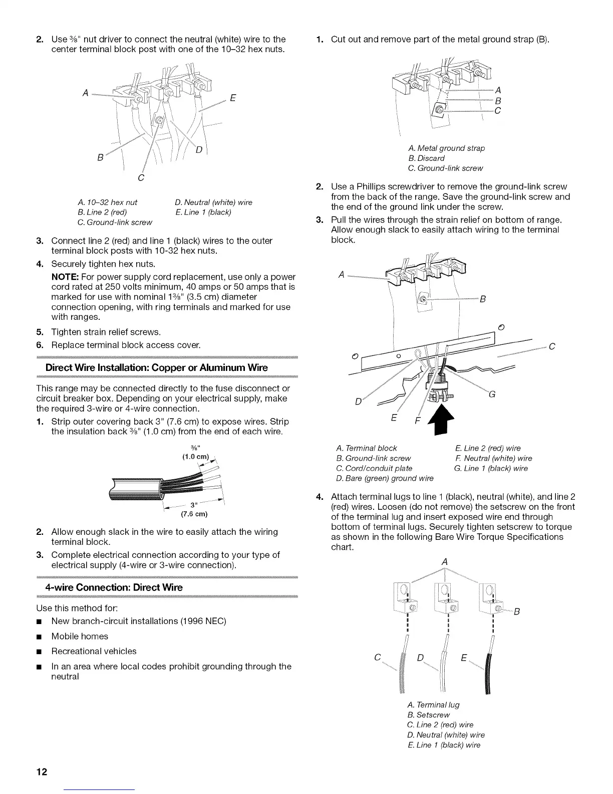 2. Use 3/8"nut driver to connect the neutral (white) wire to the 1. Cut out and remove part of the metal ground strap (B).