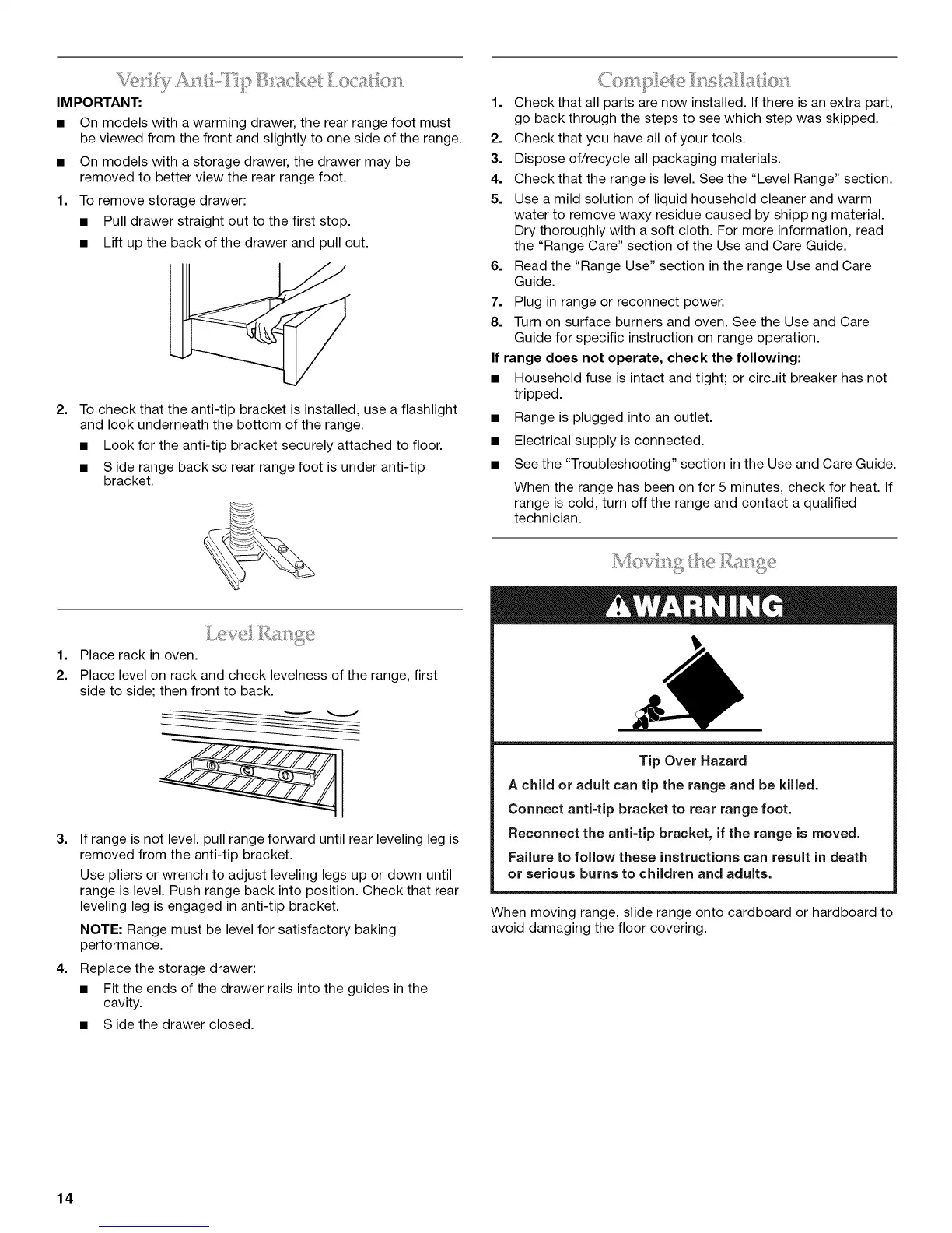 Reconnect the anti-tip bracket, if the range is moved.