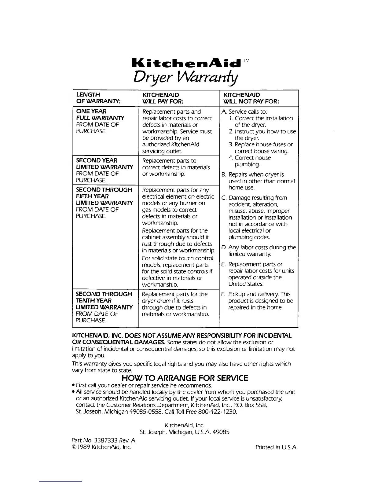 KitchenAid KEYE650V - KitchenAid Dryer Warranty; Warranty Coverage Details; Arranging for Service