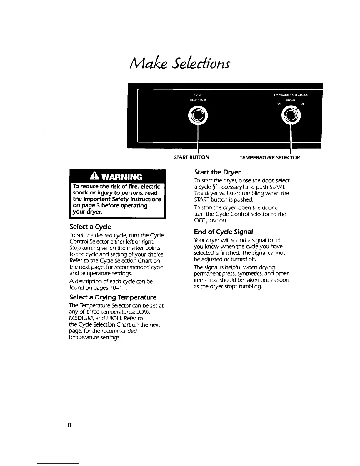 KitchenAid KEYE650V - Making Cycle and Temperature Selections; Selecting a Cycle; Selecting Drying Temperature; Starting the Dryer