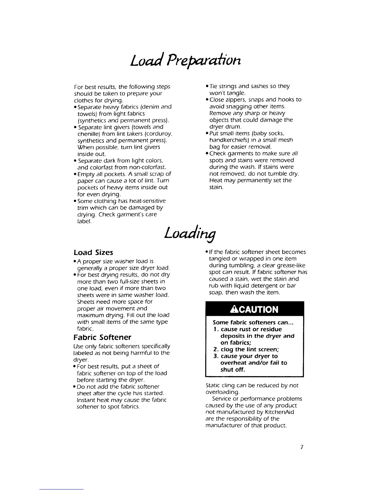 KitchenAid KEYE660W - Load Preparation; Loading; Load Sizes; Fabric Softener