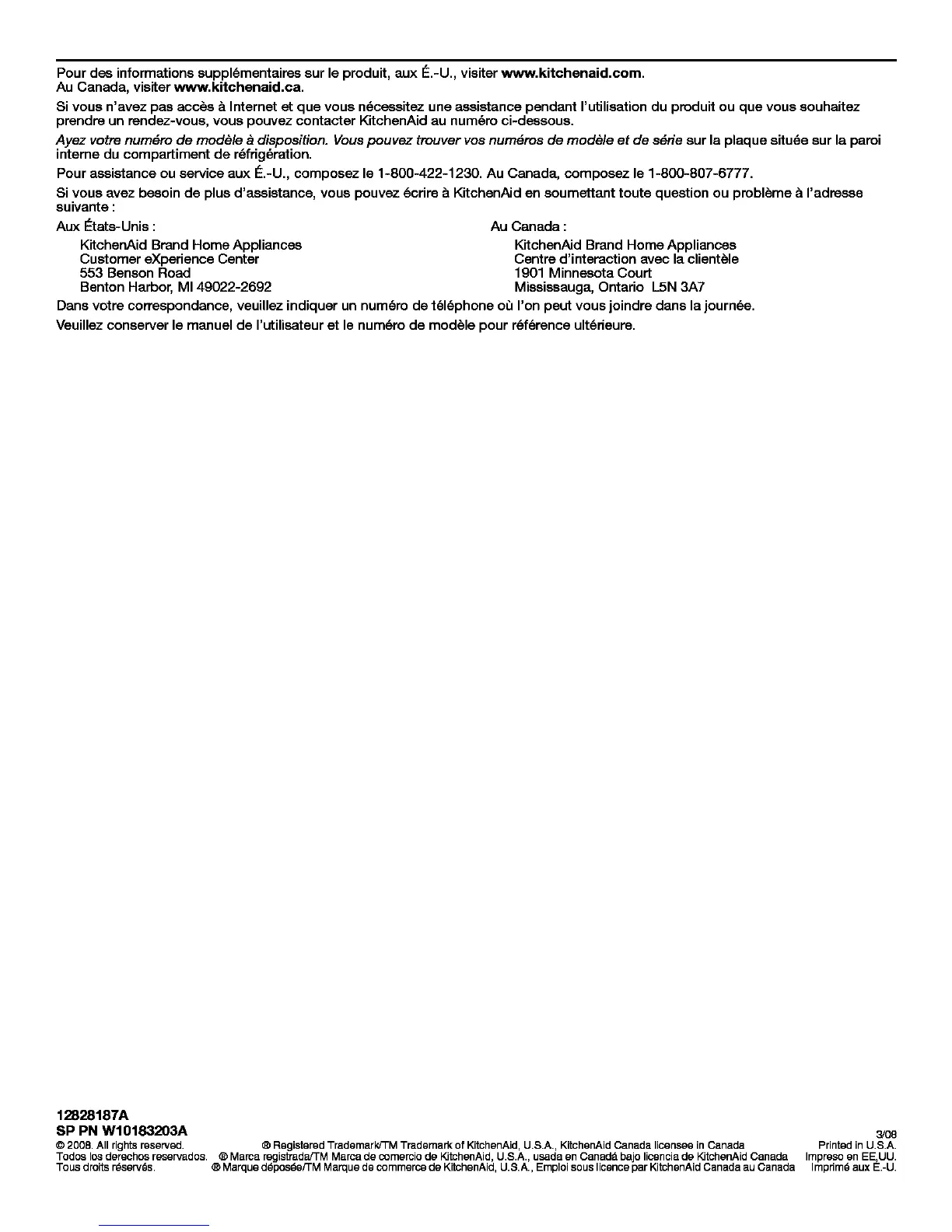Tous droits r_serv6s. ® Marqued_pos_e/TM Marquede commercede KitchenAid,U.S.A.,EmploisousIicencepar KJtchenAidCanadaauCanada Impdm_auxE.-U.