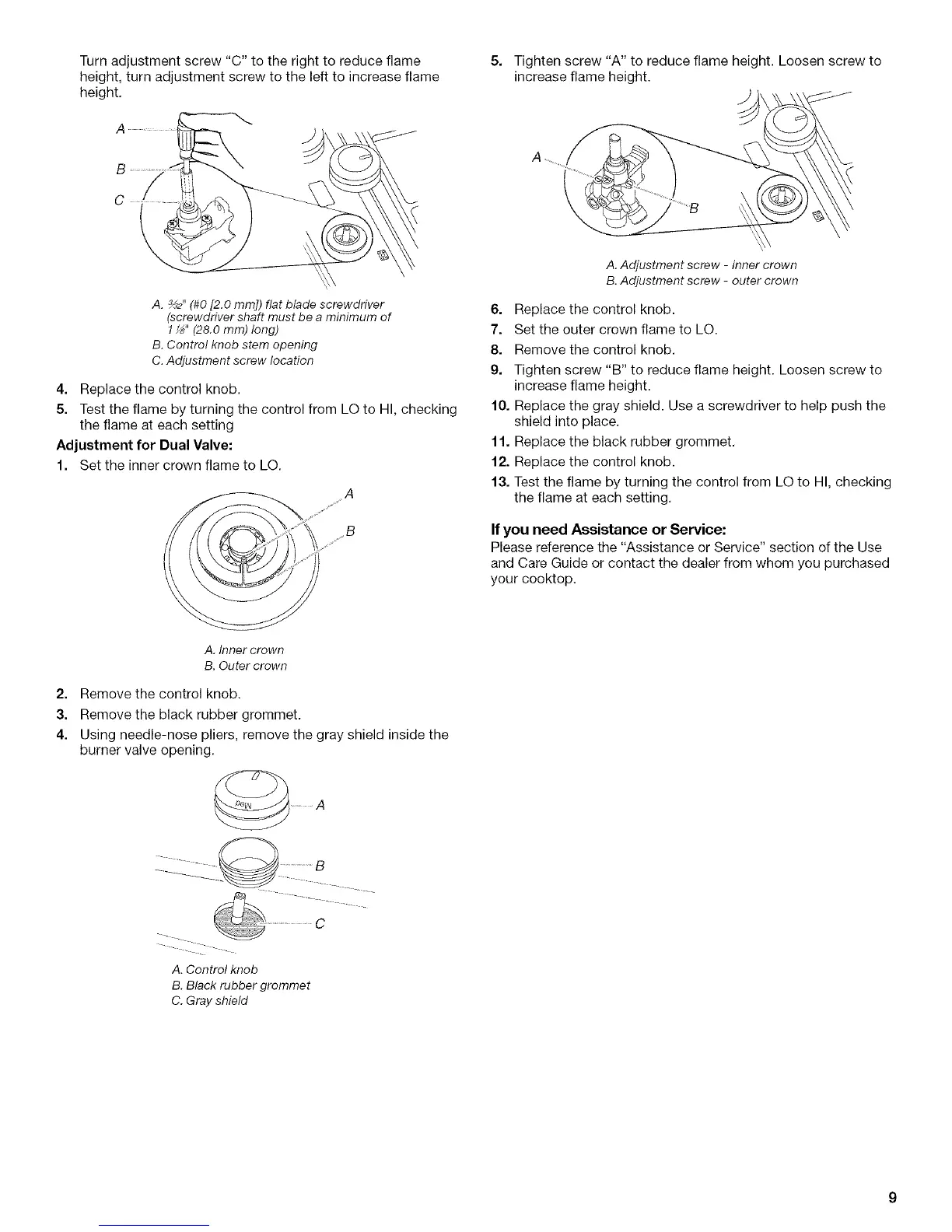 9. Tighten screw "B" to reduce flame height. Loosen screw to