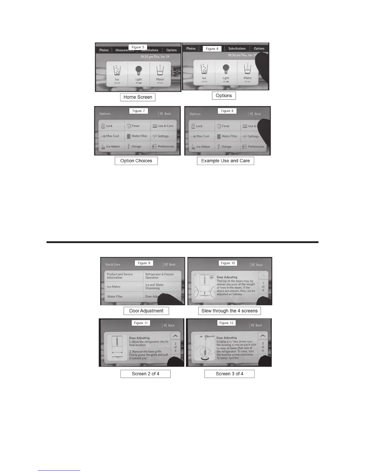 Refrigerator and Freezer Operation, Ice and Water Dispensing, Door Adjustment.
